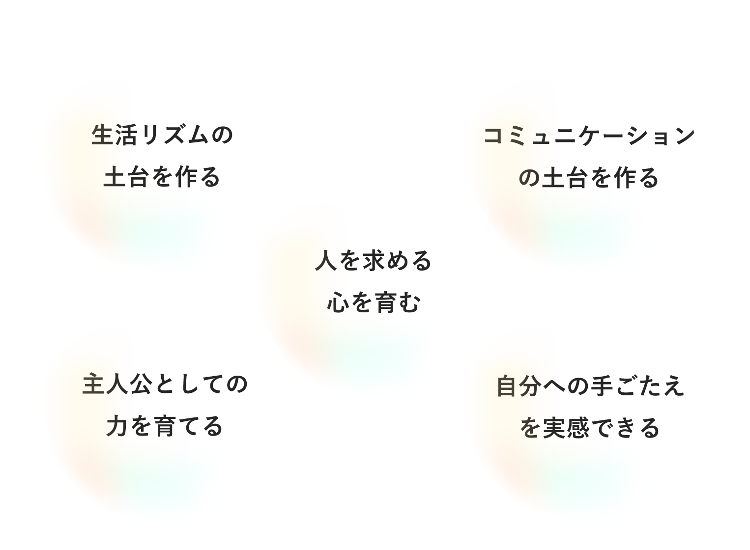 小集団の中で、人格発達の土台となる自我を丁寧に育み、以下の項目を大切に実践しながら自信や意欲を自分のものにできるよう、一人ひとりの発達に合わせた支援を行っていき、遊びの中で「体をつかう」「頭をつかう」「心をつかう」など子供の成長に必要な要素を身につけていきます。